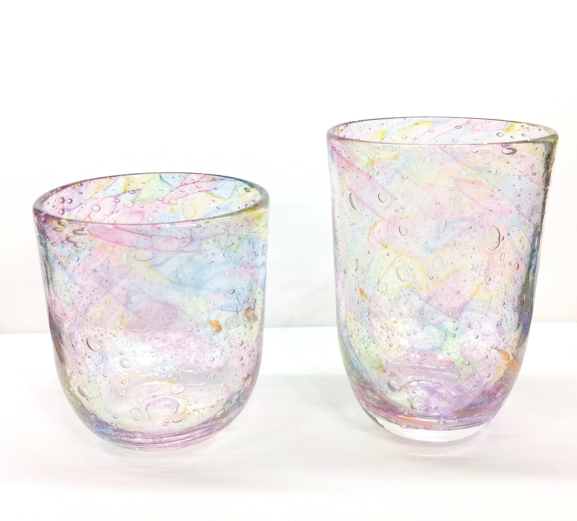 ・通常のロックグラスより少し大きめなグラスはで軽すぎず安心感のあるグラスです。不透明の飲み物(牛乳)など入れてみると面白い表情になっておすすめです。もちろん透明の飲み物でもきれいです。